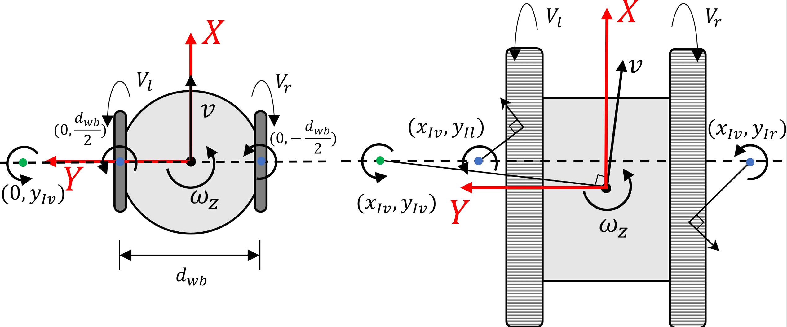 y I l , y I r y_{Il}, y_{Ir} y I l , y I r :左右驱动轮(或履带)的瞬时旋转中心在机体坐标系 y 轴上的位置。