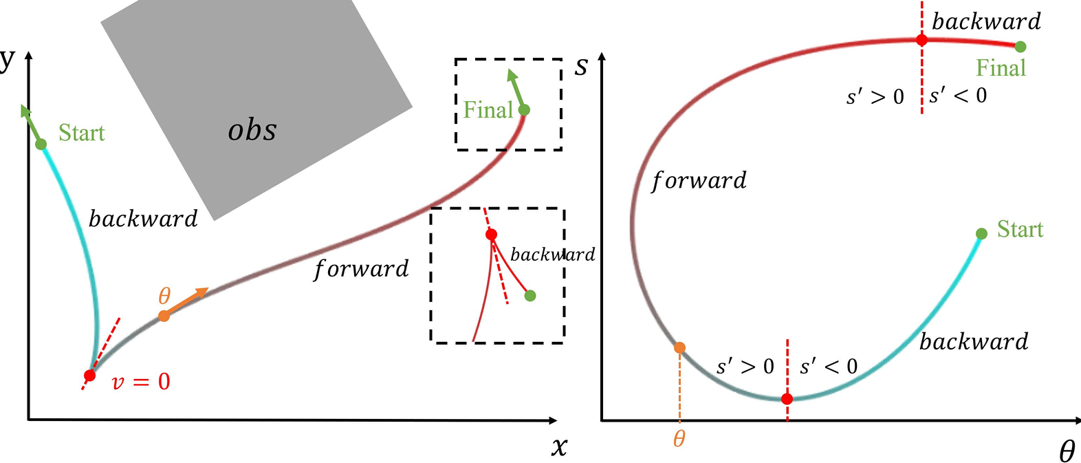优化过程: 在 MS 轨迹中,前进和后退的改变被表示为θ − s \theta-s θ − s 空间中的一条平滑轨迹。优化器通过调整多项式系数 c \mathbf{c} c 和分段时长 T \mathbf{T} T ,使得目标函数(包括平滑度 J0 和各种约束)最小化。由于 v x = s ˙ v_x = \dot{s} v x = s ˙ 是优化变量的线性组合,优化器能够自动、平滑地找到 s ˙ \dot{s} s ˙ 改变符号的点,从而确定最优的换挡时刻和位置。该框架明确要求“不同方向的运动应该被建模为一条连续轨迹,包括前进和后退运动”。