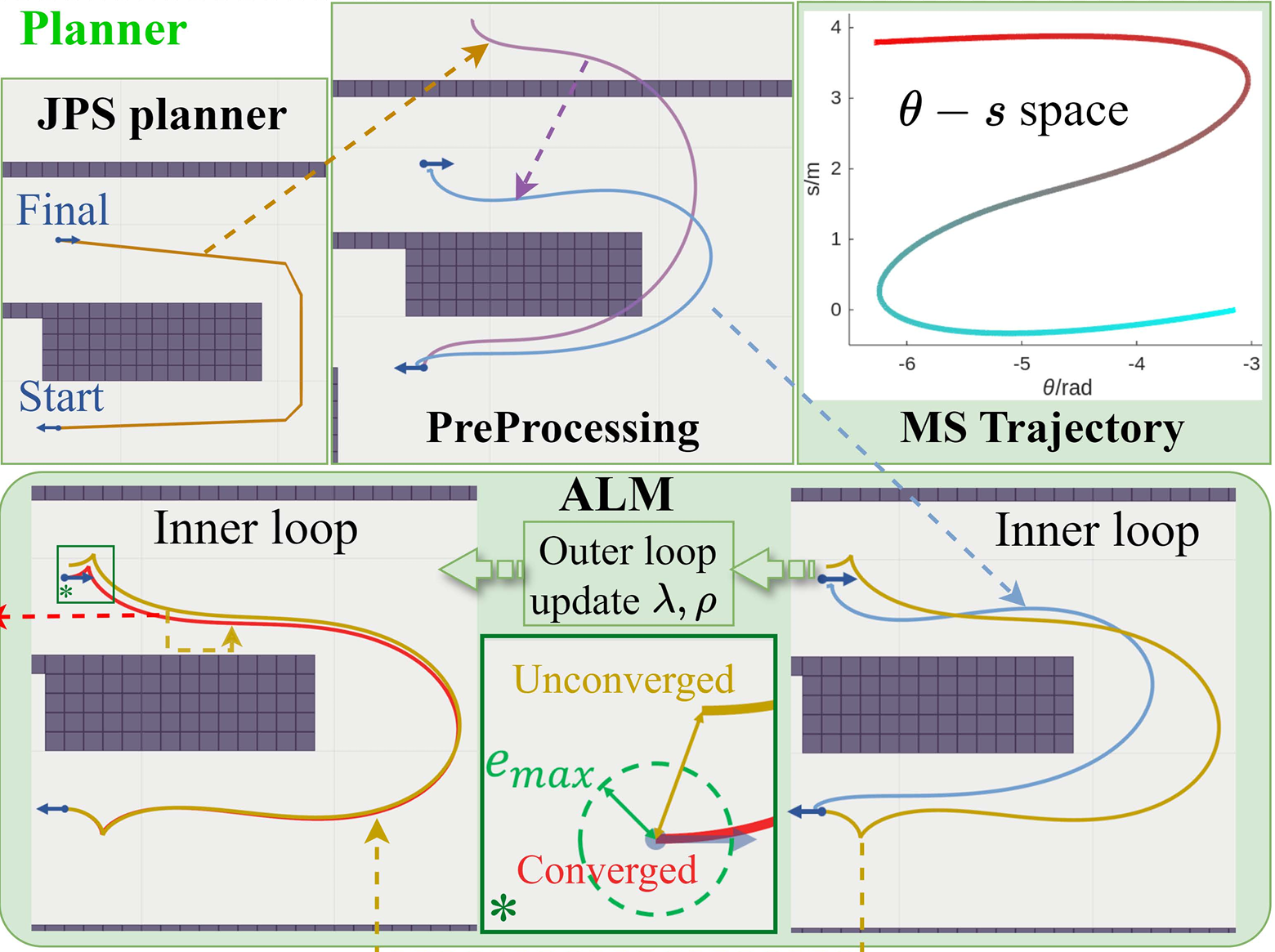 预处理阶段主要关注位置和方向的平滑过渡,并满足运动学和加速度约束。由于 MS 轨迹本身固有的平滑性和对运动状态的直接参数化,它能够在优化过程中自主地决定最优的换向时机,无需前端路径预先指定运动方向。