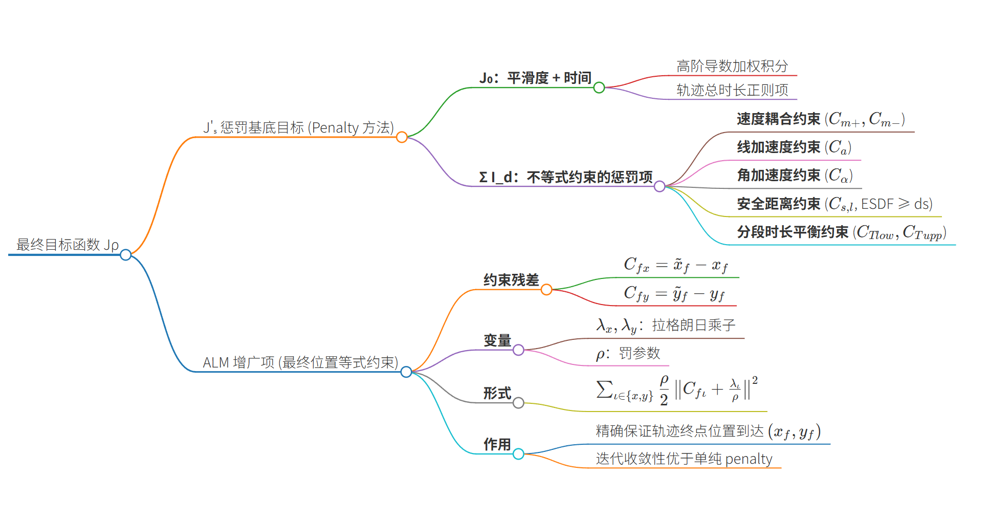 通过 ALM 增广形式,把“终点位置必须精确到目标点”这一 等式约束 纳入目标函数,保证迭代收敛到高精度。