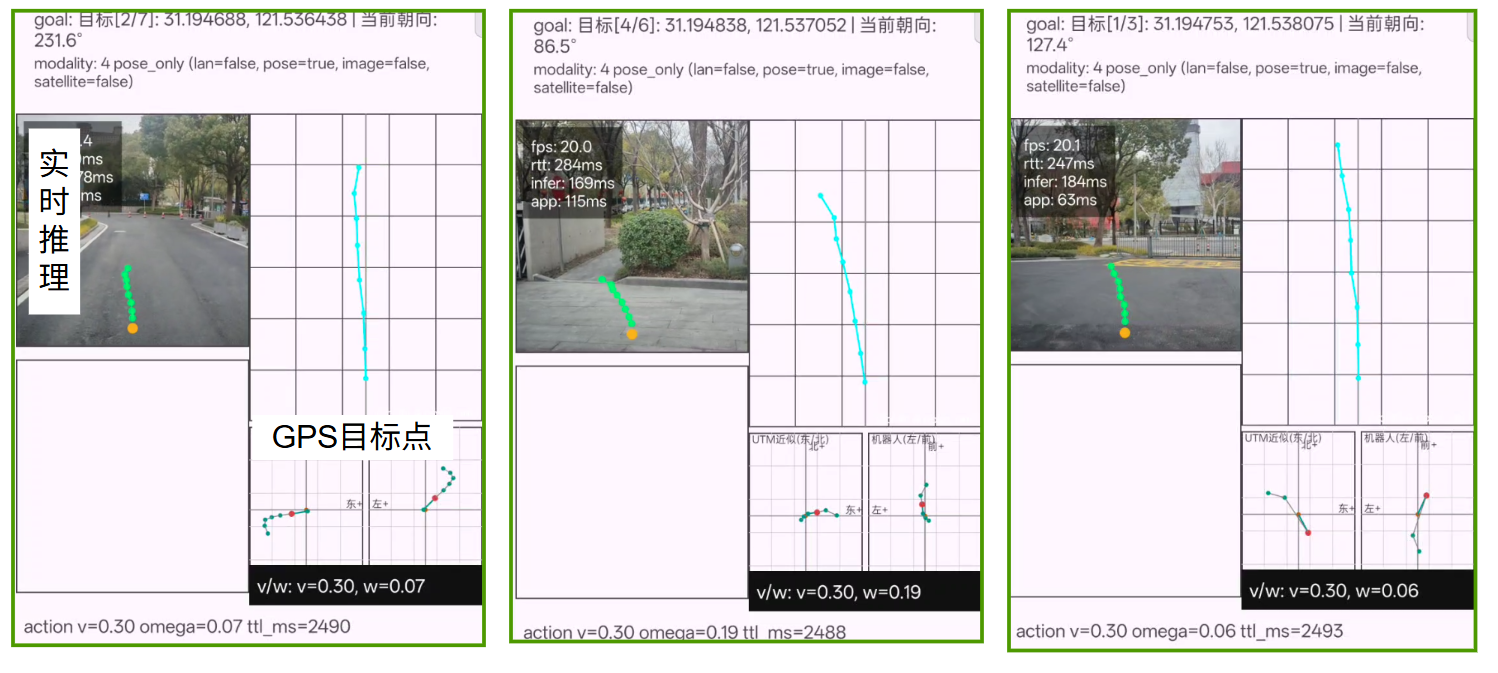 目标图像导航:无需定位建图,给定目标图像,即可实时推理轨迹,给出(v,w)控制量。