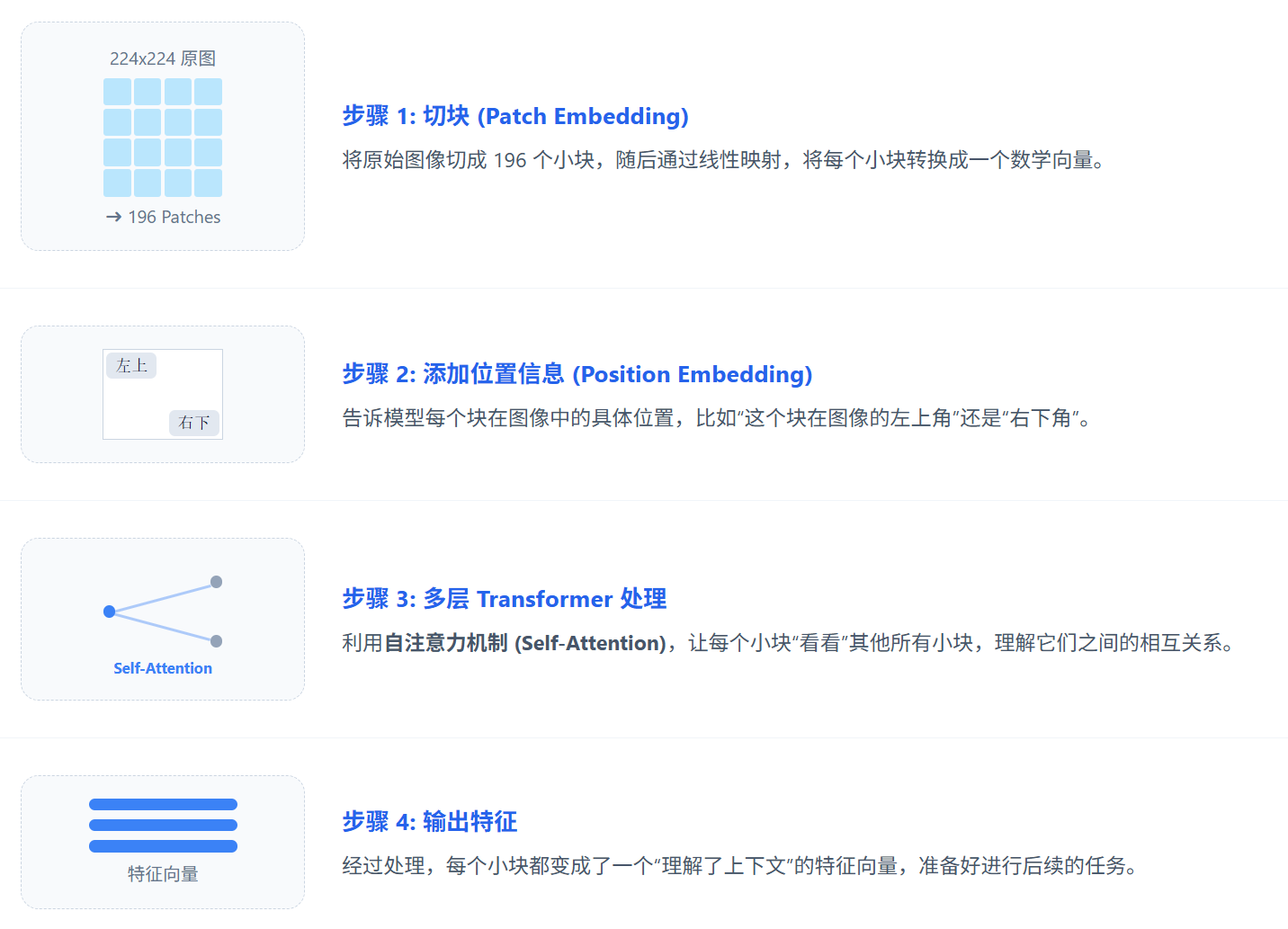 | 核心技术是什么? | Vision Transformer,把图像切块后用注意力机制处理 |