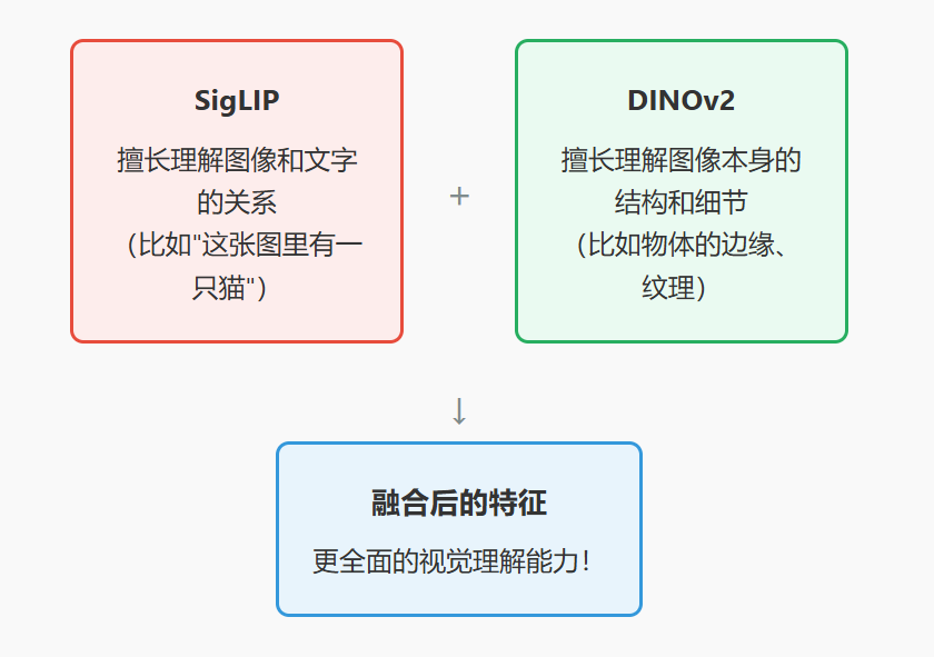 - DINOv2:擅长理解图像本身的结构和细节(比如物体的边缘、纹理) 把两个编码器的结果结合起来,就能获得更全面的视觉理解能力!