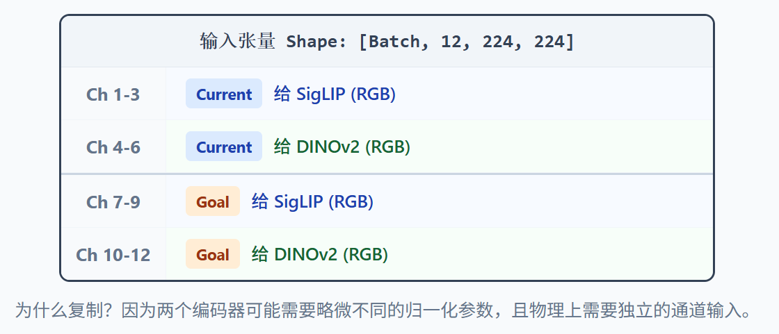 为了高效传输,系统将两张图像(每张处理成6通道)堆叠成一个巨大的 12通道张量。这是 Vision Backbone 的实际入口格式。