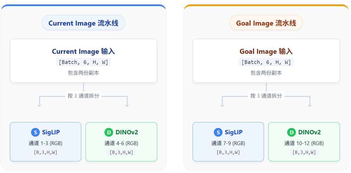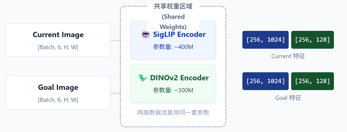 进入网络内部后,数据被拆分并流向对应的模型。关键点: SigLIP 和 DINOv2 在内存中各只有一份实例(权重共享),Current 和 Goal 图像依次通过它们。