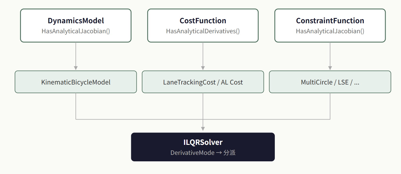 在 DynamicsModel、CostFunction、ConstraintFunction 三个基类中统一新增可选的解析求导虚方法: