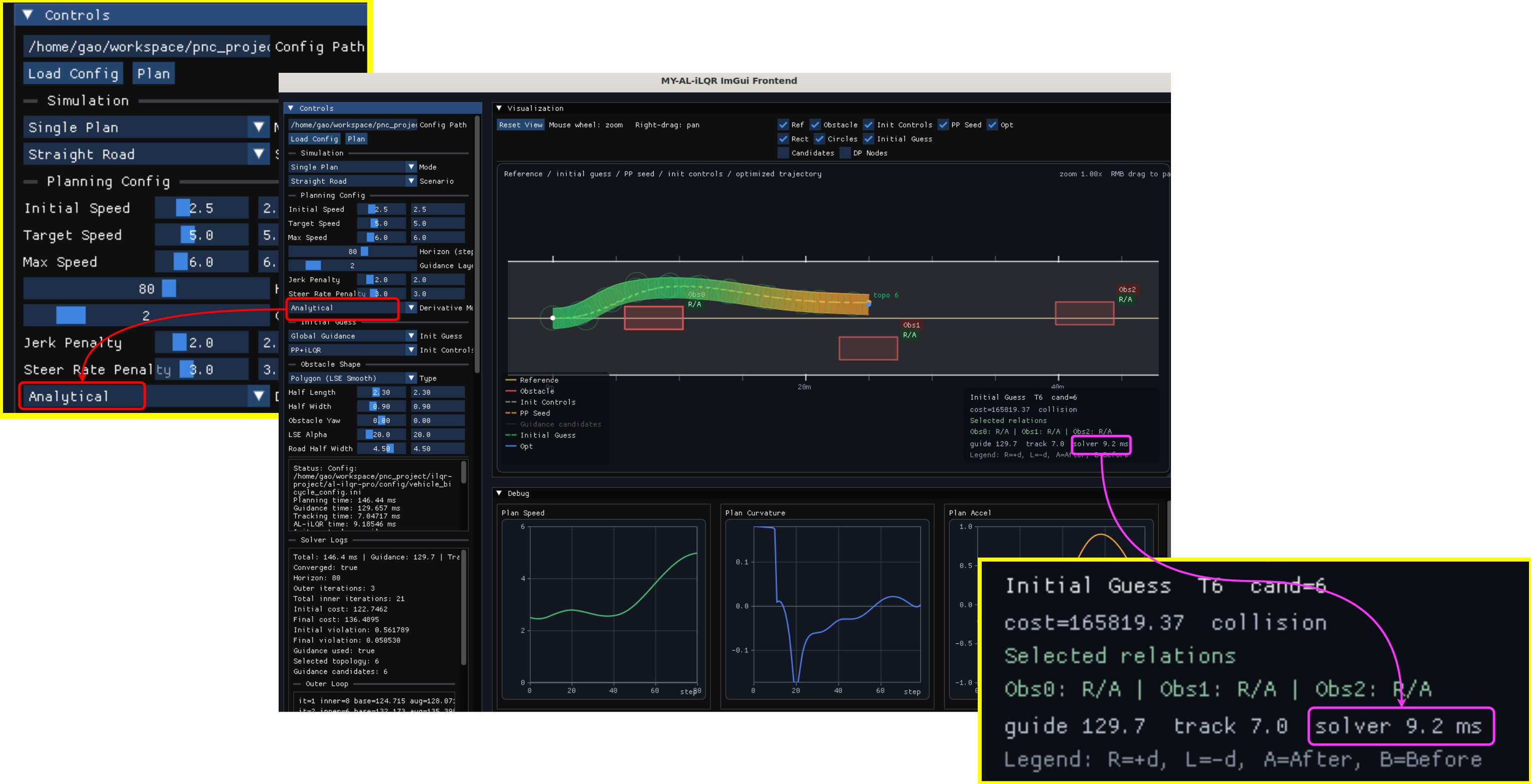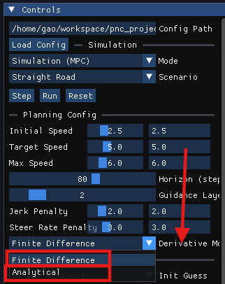 在 ImGui 前端的 Planning Config 面板中新增 Derivative Mode 下拉框,用户可实时在 Finite Difference 和 Analytical 之间切换,立即对比求解耗时和轨迹质量。