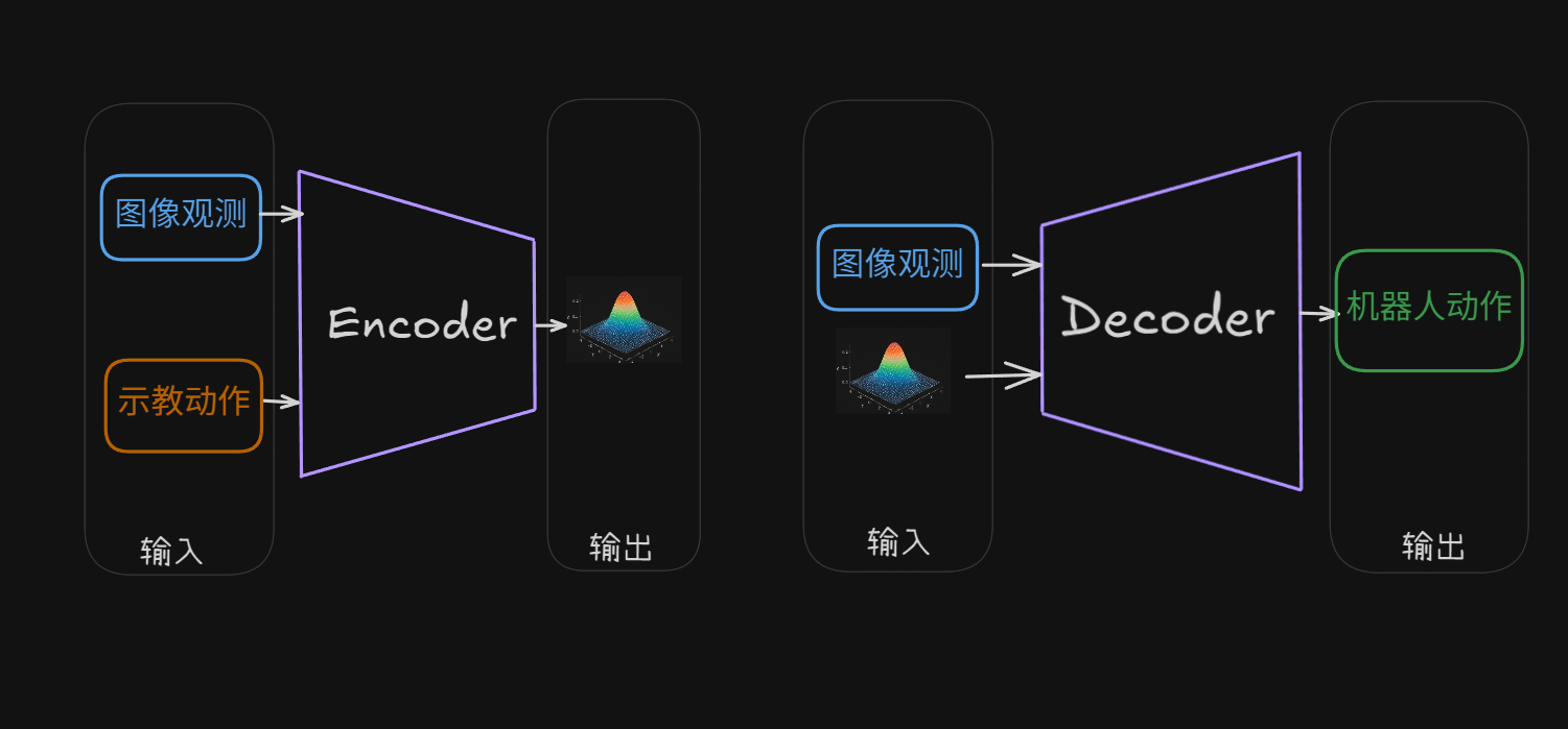 人类演示的方式很多样,CVAE 就是教机器人去理解“人类风格”,这样即使做法不同,机器人也能学会做得又快又稳、不容易失败。它的结构如下: