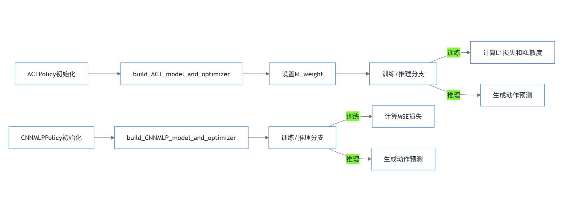 需要注意的是,在 ACT 中,CVAE 的解码器 是一个完整的 Transformer 编码器-解码器对,编码器处理复杂观察,解码器生成动作序列。因为单一Transformer解码器需要输入token逐步“翻译”动作,但原始图像信息结构复杂,不适合直接拼进去。