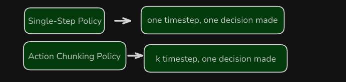 让我们对比来看一下,原来的方式是单步策略,一个时间步,只做一个决策。而动作块策略,就是k个时间步,做一个决策。