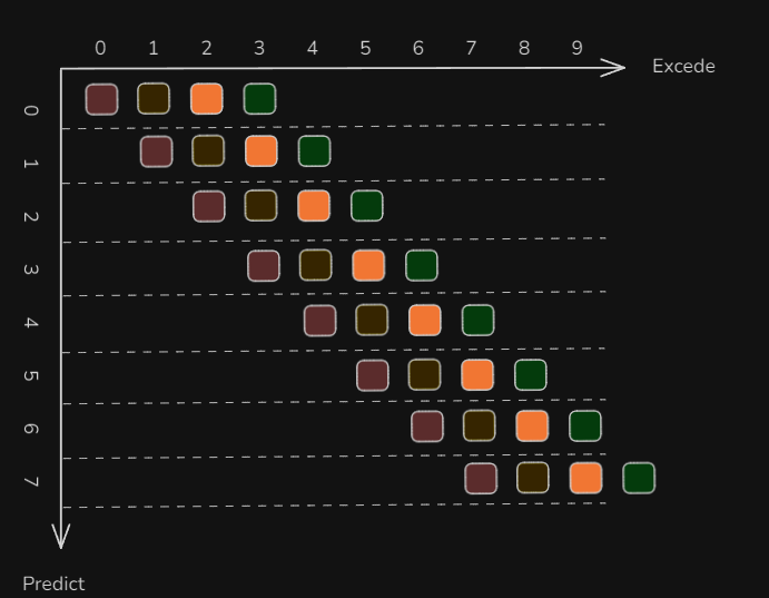 让我们把目光聚焦在下图的纵轴上,t=0的时候,做了一次决策,或者说规划了4个动作,这四个动作可以让机器人去执行,横轴就是机器人的执行时间。在纵轴t=4的时候,机器人又做了一次决策,产生了四个动作。在纵轴t=8的时候,机器人又做了一次决策,产生了四个动作。通过动作分块的方式,做了3次决策,产生了12个动作,机器人可以从t=0执行到t=11(横轴)。