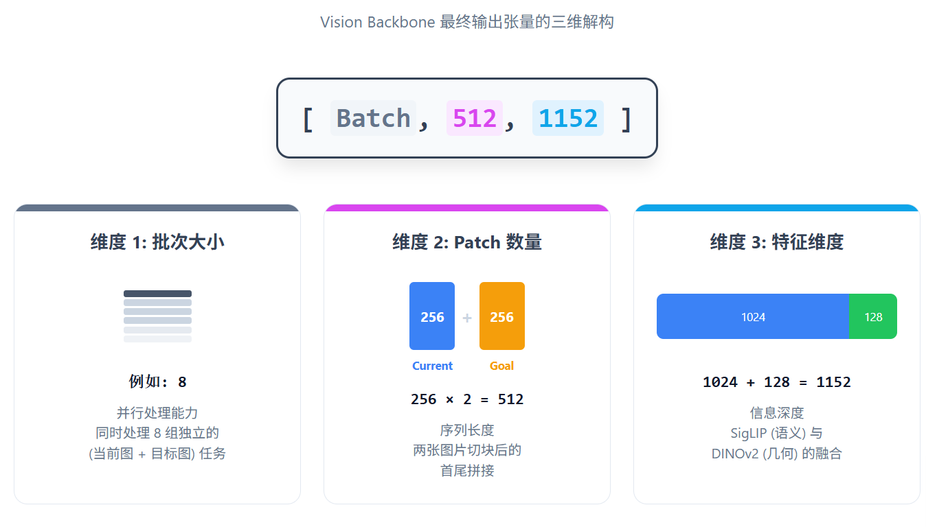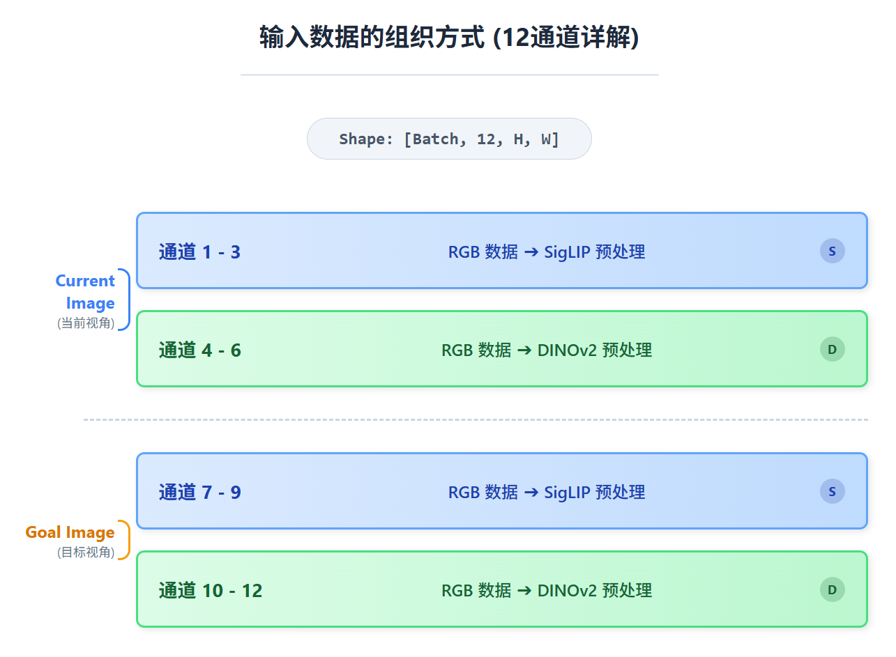进入网络内部后,数据被拆分并流向对应的模型。关键点: SigLIP 和 DINOv2 在内存中各只有一份实例(权重共享),Current 和 Goal 图像依次通过它们。