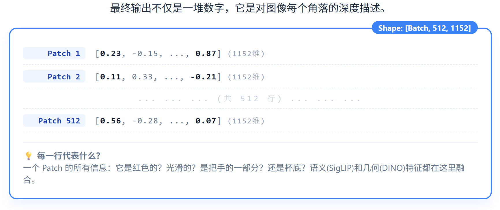 | 输出是什么? | 512个patch,每个有1152维特征向量 |