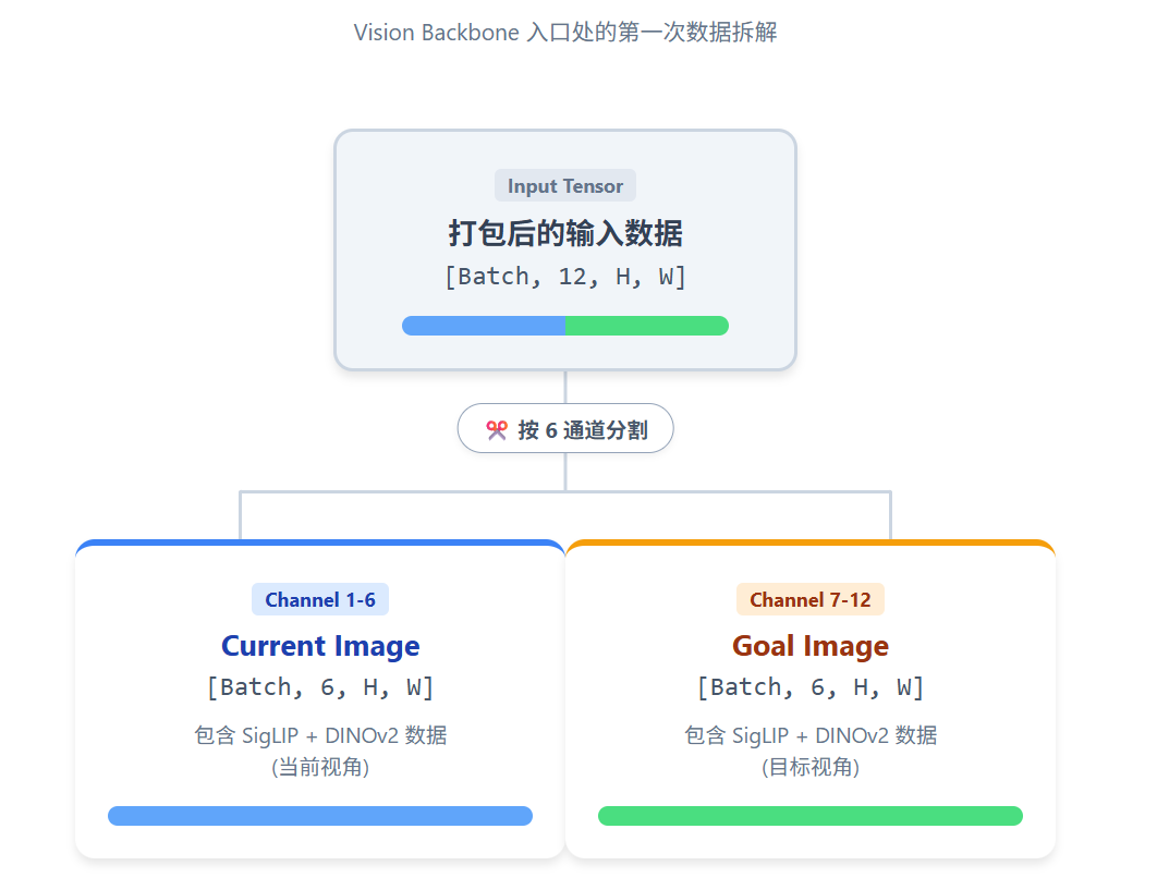 为了高效传输,系统将两张图像(每张处理成6通道)堆叠成一个巨大的 12通道张量。这是 Vision Backbone 的实际入口格式。